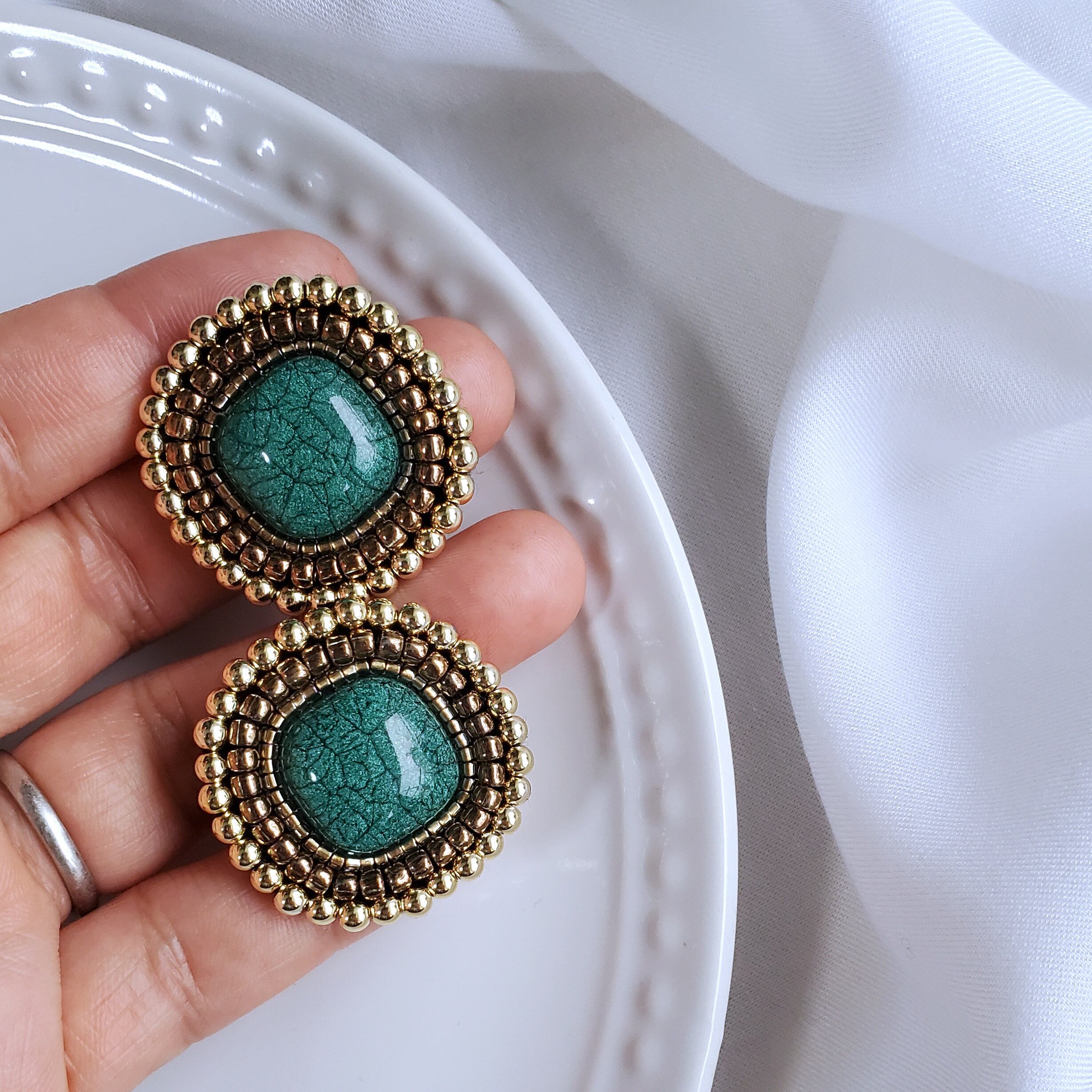 グリーン×ゴールドピアス/イヤリング【大ぶりピアス】【刺繍ピアス】 【ナチュラルイヤリング】【大ぶりピアス】【ビーズピアス】