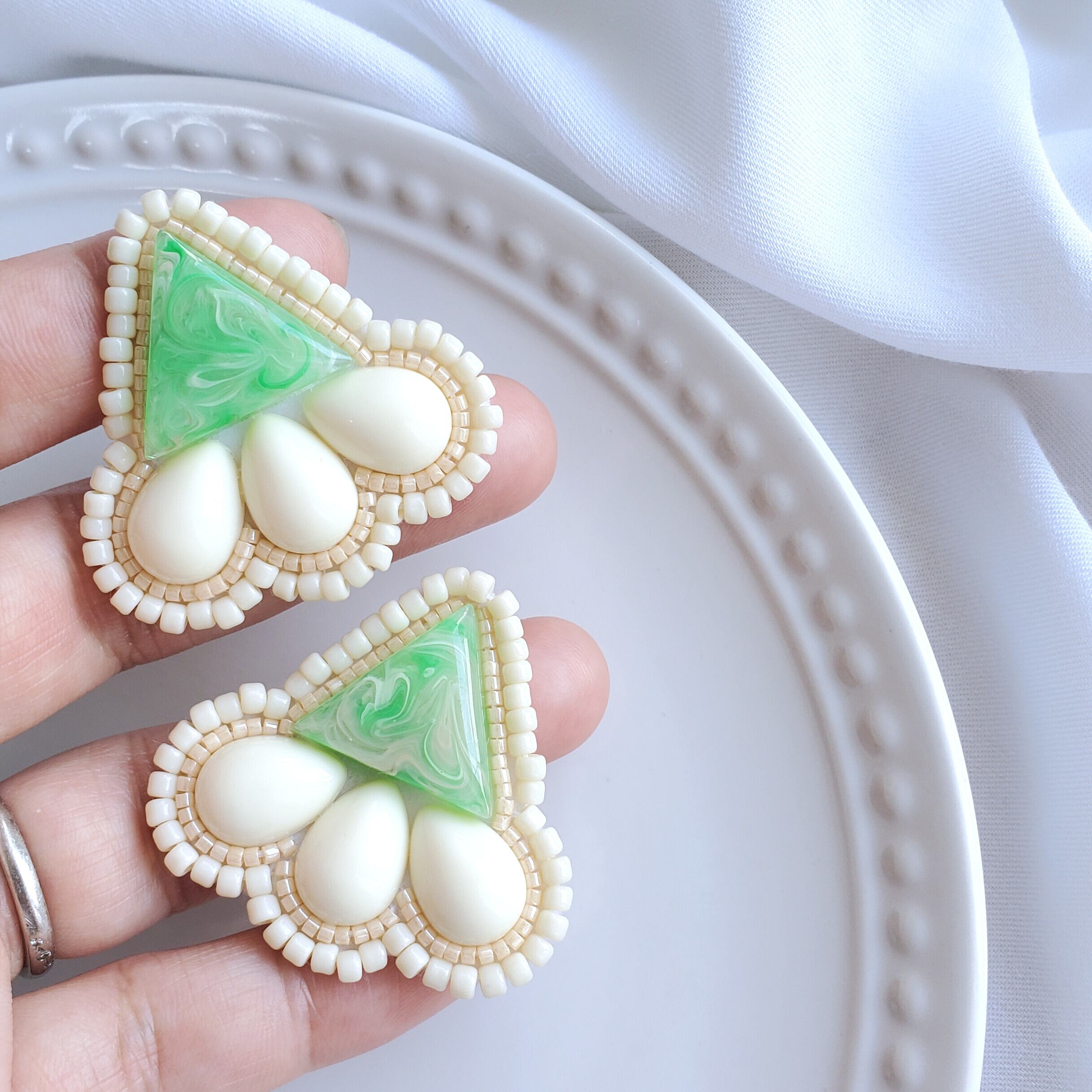 手作りのマーブル柄にアイボリービーズを合わせたピアス/イヤリングです♪