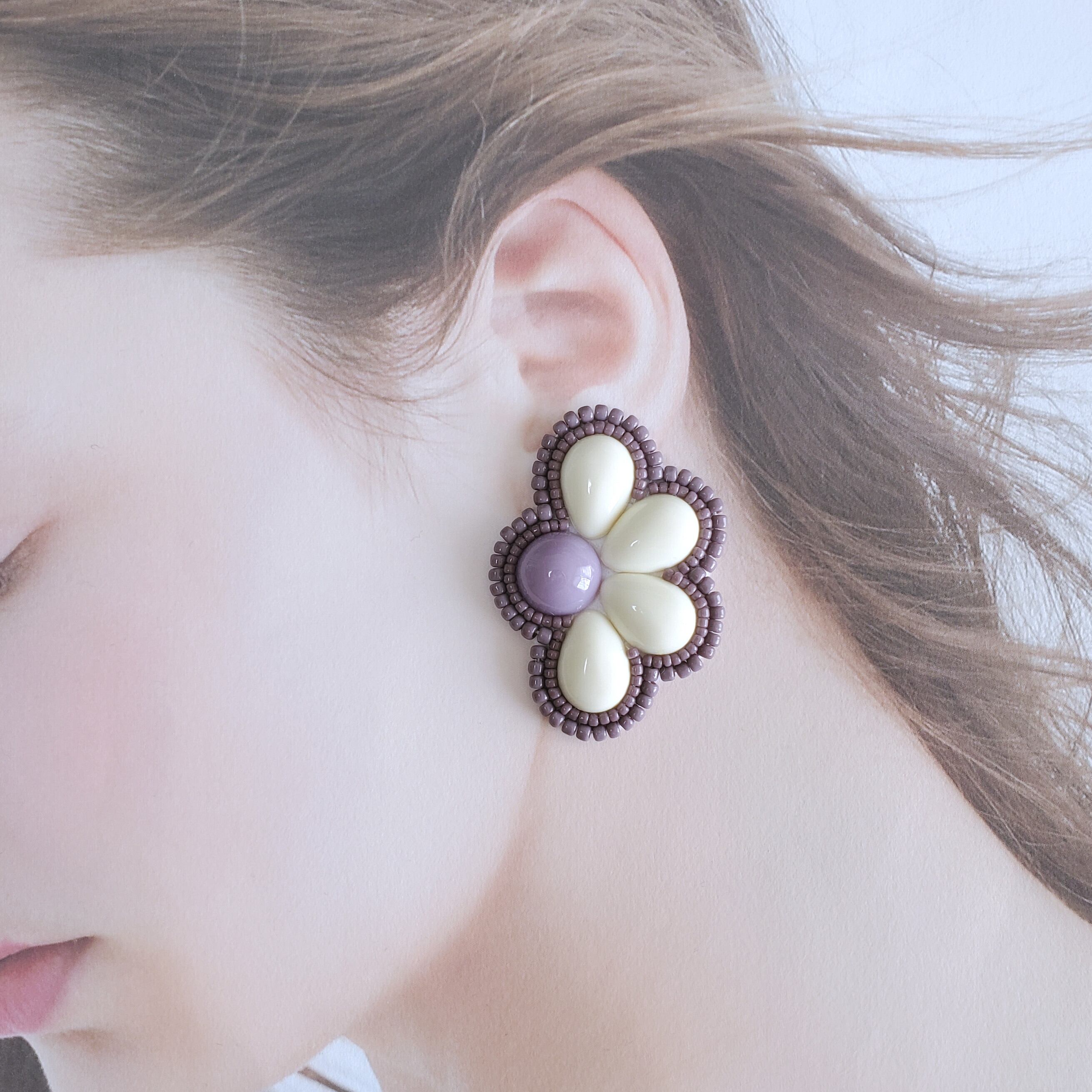 くすみカラーが可愛いラベンダー色のビーズがお洒落な大ぶりピアス/イヤリングです♪