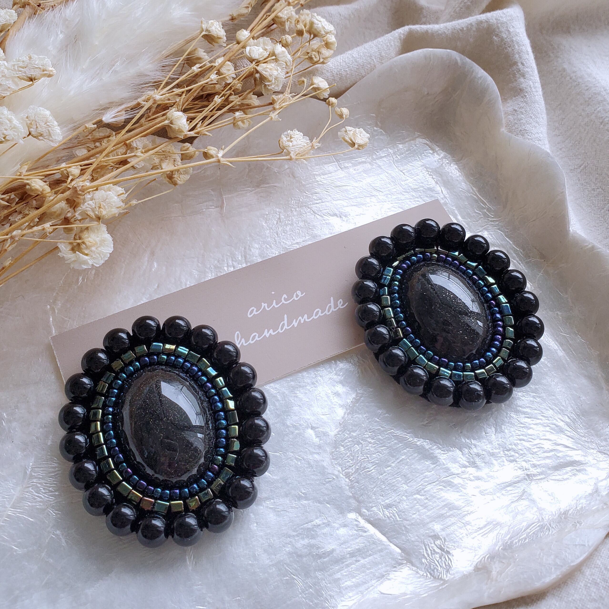 ブラックラメのパーツにメタリックビーズを刺繍した大ぶりのピアス/イヤリングです♡