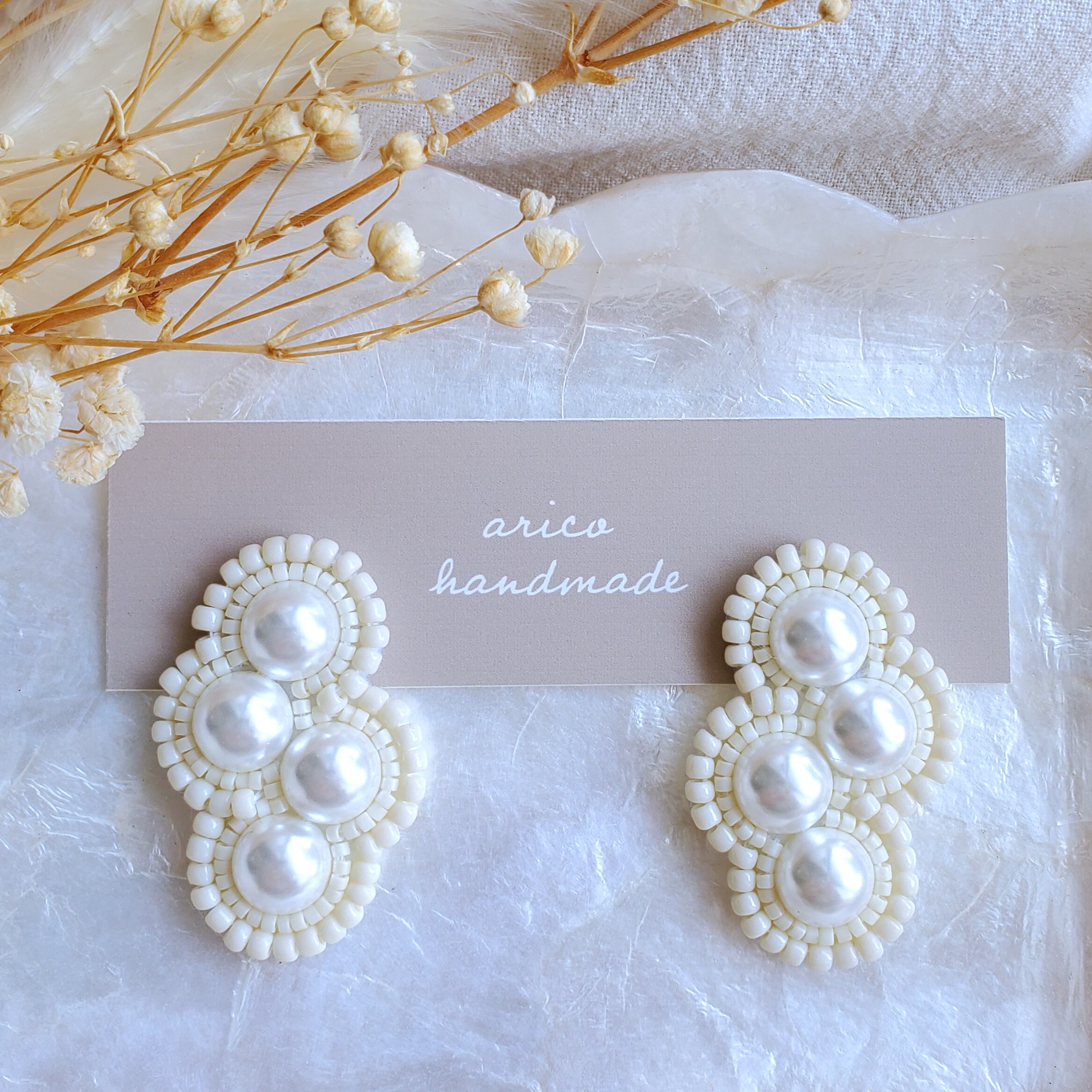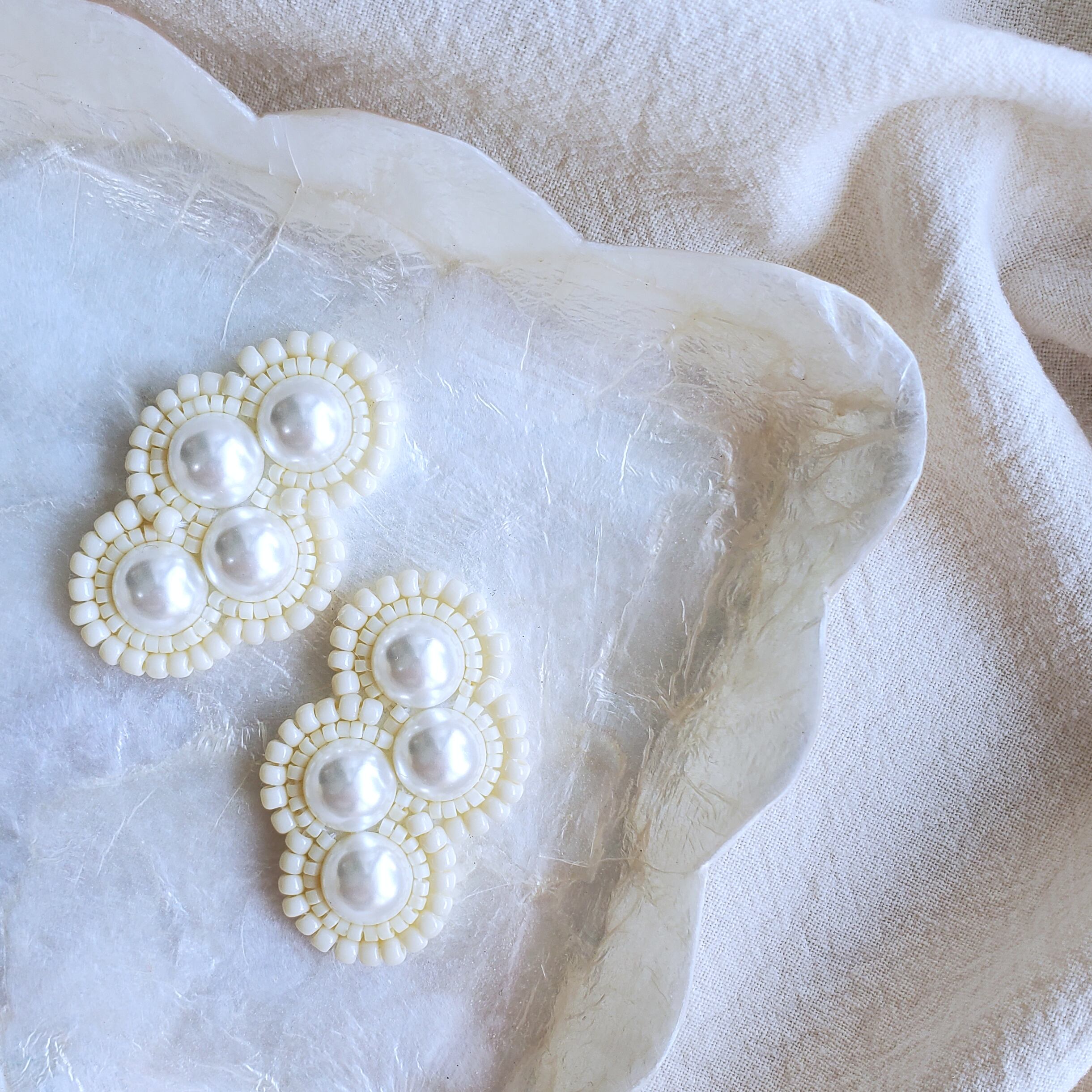 ナチュラルなアイボリーカラーのビーズとパールを組み合わせたピアス/イヤリングです♪