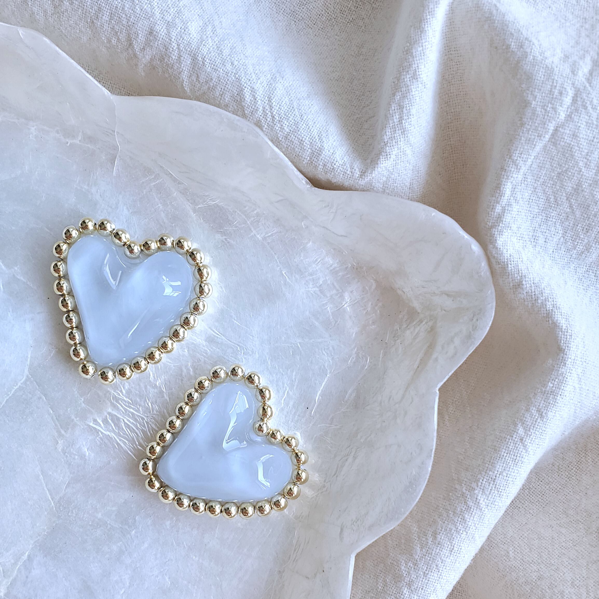 水面のようなうるうるパーツにゴールドのビーズを刺繍したピアス/イヤリングです♡