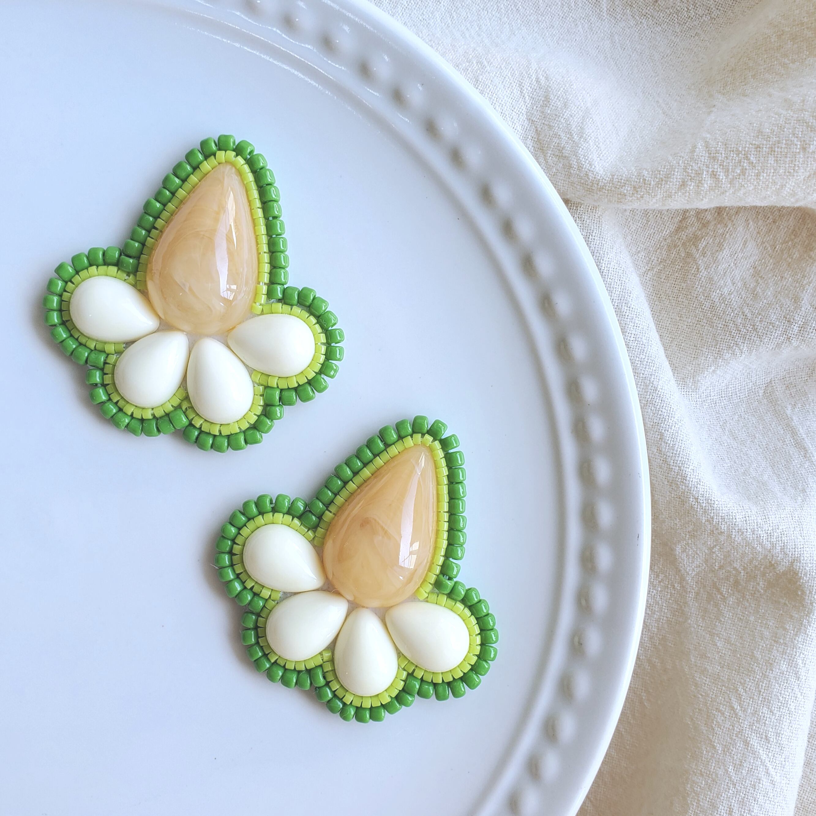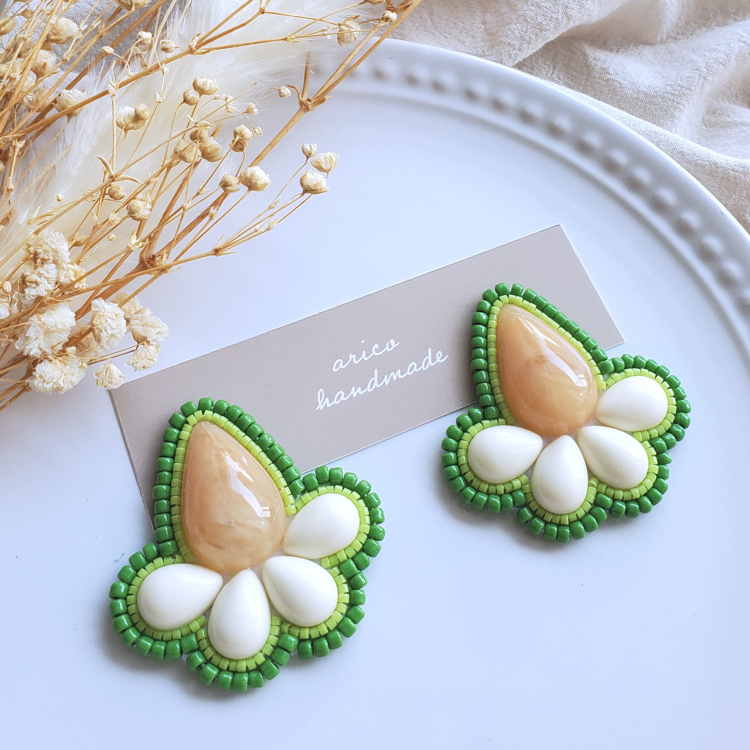 オレンジのマーブル柄にグリーンのビーズを合わせたピアス/イヤリングです♡
