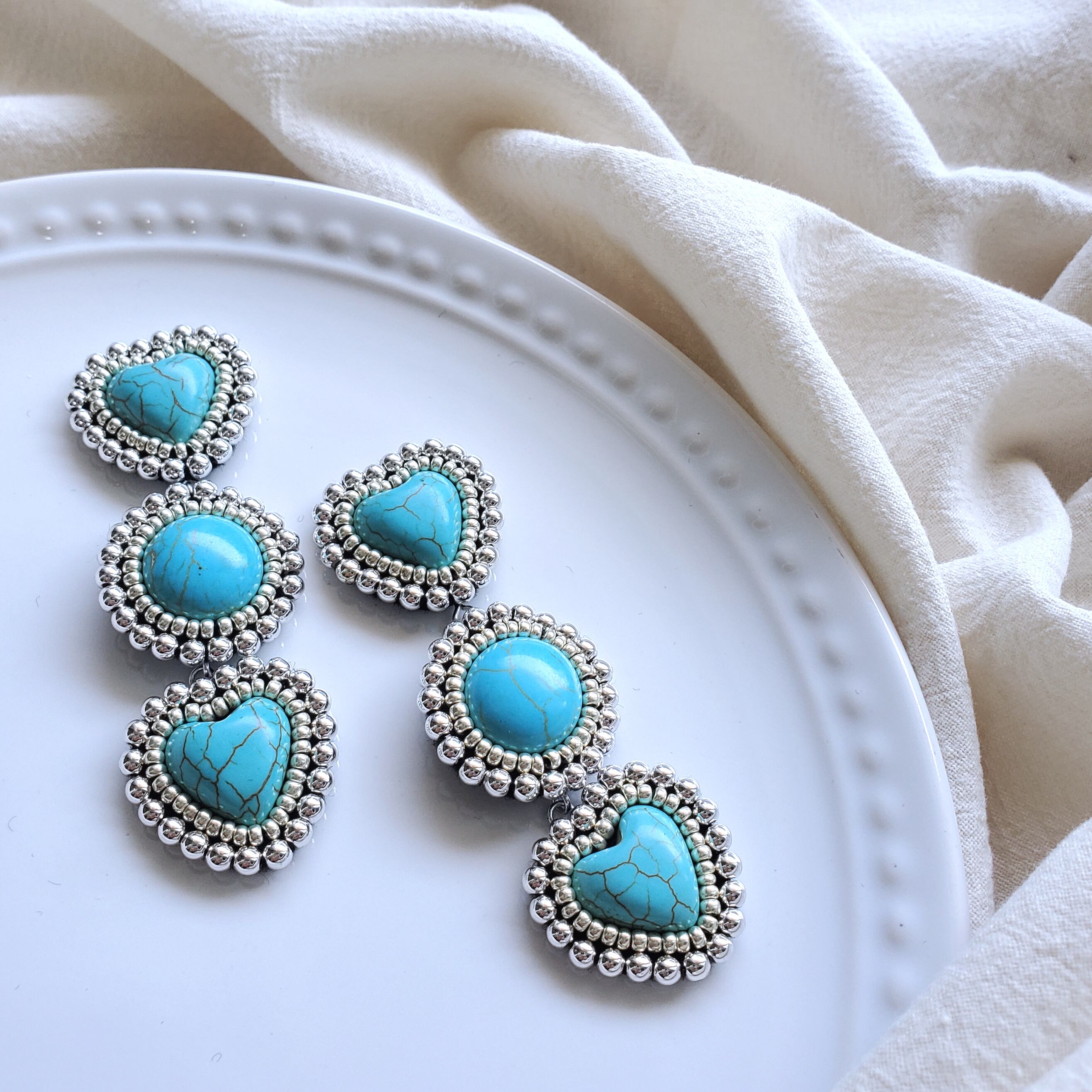 ハート形とラウンド形のターコイズにシルバービーズを刺繍したロングピアス/イヤリング♡