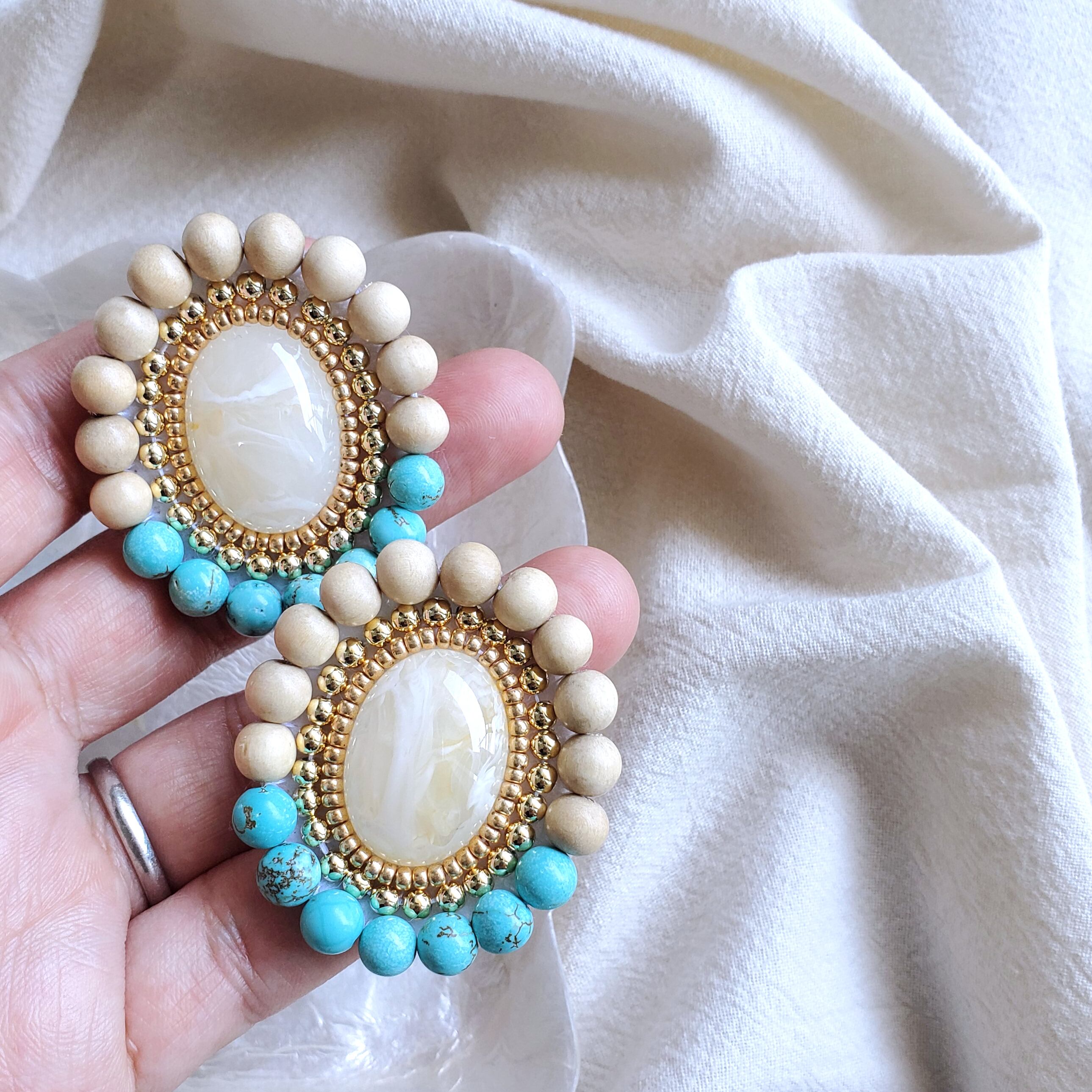 ベージュのマーブル柄に同系色のゴールドビーズを刺繍して、ナチュラルなウッドビーズとターコイズビーズを合わせました♡