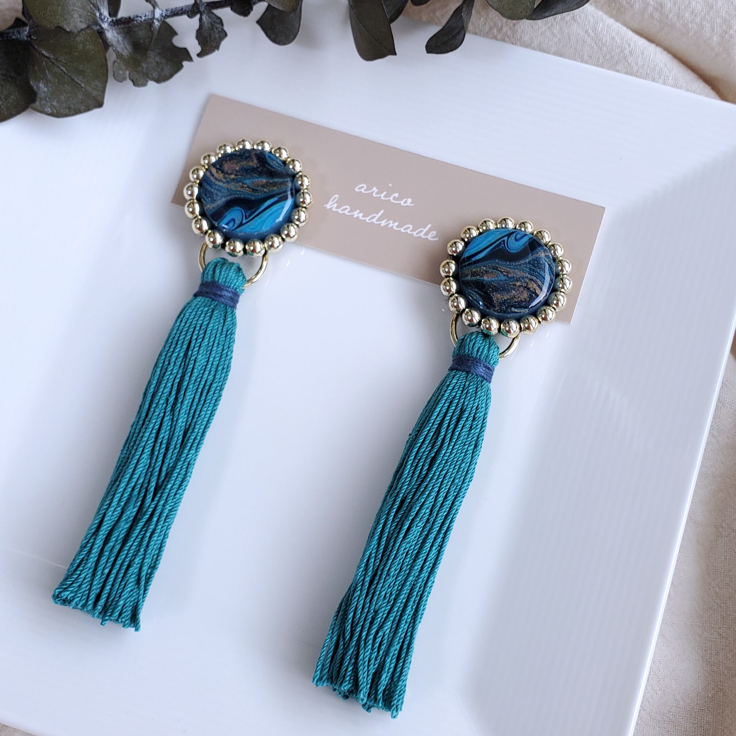 エスニックプリントが可愛いパーツに同系色のタッセルを合わせたピアス/イヤリングです♪